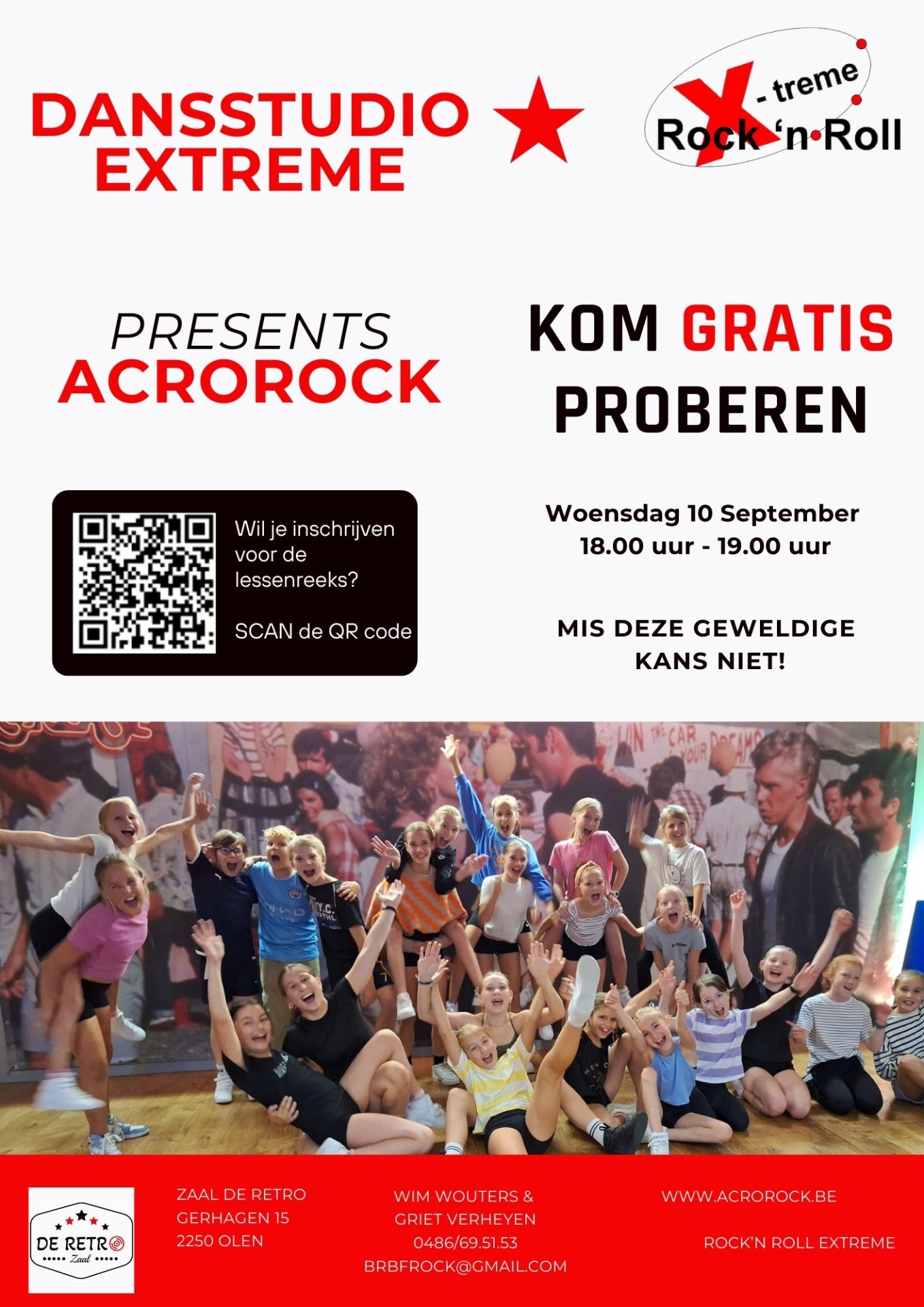 Acrorock of Rock 'n Roll is een moderne dansstijl gecombineerd met sensationele acrobatiek. Hou je ervan als man je dame in de lucht te gooien of vindt je dame het spannend om in het luchtruim te vertoeven ... dan is acrobatische Rock 'n Roll 'de dans' die perfect bij jullie past. Deze acrobatische figuren worden opgebouwd van erg makkelijk naar moeilijk. Dit gebeurt zowel op authentieke als moderne Rock ´n Roll muziek.
